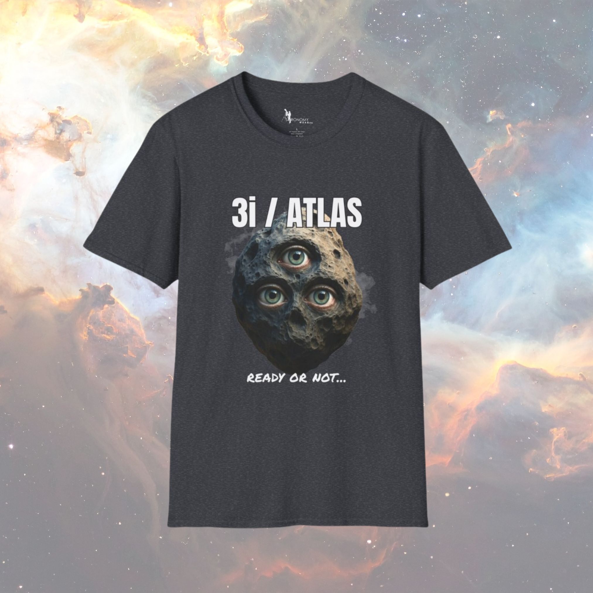 This tee puts a surreal, three-eyed asteroid front and center with a bold 3I/ATLAS header and “Ready or Not…” footer—perfect for believers, skeptics, and late-night telescope talkers. Printed on a soft unisex shirt that fits right and holds its shape.